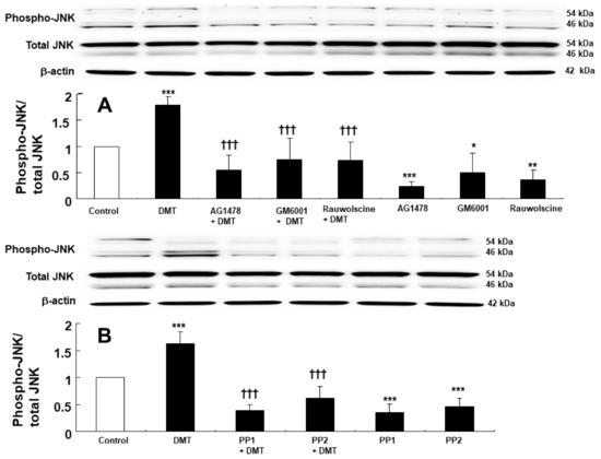 (A): Effects of AG1478 (10−5 M), GM6001 (3 × 10−5 M), and rauwolscine (10−6 M) on the c-Jun NH2-terminal kinase (JNK) phosphorylation induced by dexmedetomidine (DMT, 10−6 M) in rat aortic vascular smooth muscle. Data (N = 5) are shown as mean ± SD. N indicates the number of independent experiments. * p < 0.05, ** p < 0.01, and *** p < 0.001 versus control. Control indicates no treatment. ††† p < 0.001 versus DMT alone. (B): Effects of PP1 (10−5 M) and PP2 (10−5 M) on the JNK phosphorylation induced by DMT in rat aortic vascular smooth muscle. Data (N = 5) are shown as mean ± SD. N indicates the number of independent experiments. Control indicates no treatment. *** p < 0.001 versus control. ††† p < 0.001 versus DMT alone.