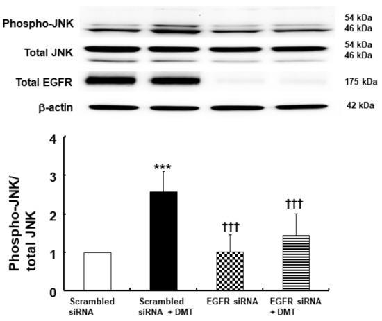Effect of dexmedetomidine (DMT, 10−6 M) on c-Jun NH2-terminal kinase (JNK) phosphorylation in rat aortic vascular smooth muscle cells transfected with scrambled siRNA and epidermal growth factor receptor (EGFR) siRNA. Data (N = 4) are shown as mean ± SD. N indicates the number of independent experiments. *** p < 0.001 versus scrambled siRNA. ††† p < 0.001 versus scrambled siRNA + DMT.