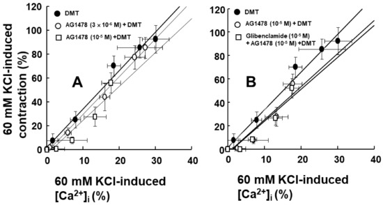 Dexmedetomidine-induced contraction is mainly dependent on the calcium influx that occurs via voltage-gated calcium channels [12]. In addition, epidermal growth factor induces vasoconstriction and increases the cytosolic free calcium concentration [10]. AG1478 attenuated the simultaneous [Ca2+]i and contraction that was induced by the dexmedetomidine treatment (Figure 6A,B). Furthermore, AG1478 did not significantly alter the slope of the [Ca2+]i–tension relationship that was induced by dexmedetomidine (Figure 7A), suggesting that dexmedetomidine-induced contraction via EGFR transactivation is mediated by increased calcium levels, which mediates calcium-dependent contraction. ATP-sensitive potassium channels have been reported to be involved in epidermal growth factor-induced lung epithelial cell repair [24]. However, when treatments were combined with the ATP-sensitive potassium channel inhibitor glibenclamide and AG1478, it still did not significantly alter the slope of the calcium concentration–tension relationship that was induced by dexmedetomidine treatment compared with AG1478 alone (Figure 7B). This suggests that dexmedetomidine-induced [Ca2+]i increase and contraction via EGFR transactivation are not modulated by ATP-sensitive potassium channels.