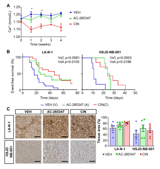 AC-265347 delays NB tumor growth while maintaining plasma calcium levels. (A) Healthy athymic mice were treated with 10 mg/kg of AC-265347, CIN or their vehicle (n = 5). Blood samples were collected from tail vein and ionised plasma calcium concentration (mmol/L) was measured weekly. Each point represents mean ± SEM of each group. Statistical significance was calculated using One-way ANOVA with Dunn’s correction. * p < 0.005. (B) Event-free survival (EFS) rates of mice bearing LA-N-1 xenografts (n = 17) or HSJD-NB-001 (n = 6) treated with 10 mg/kg of AC-265347, CIN or their vehicle. Log-rank statistics with a Bonferroni correction test was used to compare statistical significance between groups (LA-N-1: p = 0.0186, VEH vs. AC-265347; p = 0.0003, VEH vs. CIN; p = 1, CIN vs. AC-265347; HSJ-NB-001: p = 0.0105, VEH vs. AC-265347; p = 0.0081, VEH vs. CIN; p = 1, CIN vs. AC-265347). (C) Left: Formalin-fixed, paraffin-embedded sections of LA-N-1 and HSJD-NB-001 tumors exposed to treatment were stained with anti-CaSR. Right: Images were acquired with TissueFAXS at ×20 magnification and percentage of positive area per tumor was quantified using STRATA Quest. Statistical analysis between groups was calculated using a Mann–Whitney test (p > 0.05 for all the comparisons). Each symbol represents an individual tumor and bars represent mean ± SEM. Scale represents 100 µm.