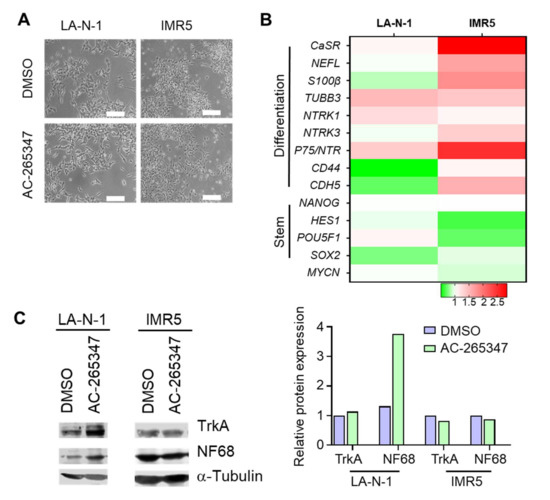 - Eggert, A.; Ikegaki, N.; Liu, X.G.; Chou, T.T.; Lee, V.M.; Trojanowski, J.Q.; Brodeur, G.M. Molecular Dissection of TrkA Signal Transduction Pathways Mediating Differentiation in Human Neuroblastoma Cells. Oncogene 2000, 19, 2043–2051. [Google Scholar] [CrossRef] [PubMed] [Green Version]