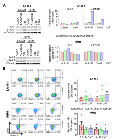 Acute exposure to AC-265347 differently affects NB cells. (A) Left: Immunoblot of cleaved-Parp (c-Parp) and full-length PARP (PARP) from LA-N-1 and IMR5 cells exposed to 1µM of AC-265347, CIN or vehicle (DMSO) in the presence of 0.5 or 3 mM of CaCl2, for 24 h. Right: Quantification of immunoblots; bars represent band intensity relative to α-tubulin. (B) Left: IMR5 and LA-N-1 cells were stained with SYTOX and Annexin V after a 16-h exposure to 1µM of CIN, AC-265347 or their vehicle (DMSO) in the presence of 0.5 or 3 mM of CaCl2. Right: Annexin V positive cells in each treatment were quantified by flow cytometry. Statistical analysis between groups was calculated using a Mann–Whitney test (p > 0.05 for all the comparisons). Each symbol represents an individual experiment and bar represents mean + SEM.