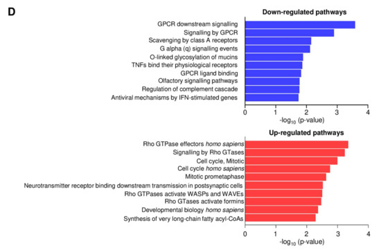 To identify relevant biological processes that might be involved, Reactome enrichment analysis was performed. The most significant upregulated biological pathway induced by AC-265347 relates to RHO GTPases signaling. Among downregulated genes, the most differentially expressed were involved in GPCR downstream signaling (Figure 5D).