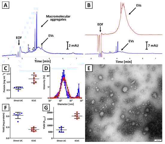 Comparison of isolates obtained with (blue trace) direct UC and (red trace) ICUC methods. (A,B) CE analysis of exemplary isolates. Asterisks (*) indicate soluble impurities. (C) Total protein concentration was assessed with a BCA test. (D) DLS analysis of isolates. Error bars indicate the standard deviation (SD) of measurements performed for 3 independently obtained isolates. (E) TEM image of an isolate obtained with ICUC technique. The size bar is equal to 100 nm. (F) Isolation yield is expressed as total protein content. (G) Isolation yield calculated based on CE analyses results (Acorr) using Equation (2). Bars (C,F,G) represent the mean and SD calculated for 6 independently obtained isolates.