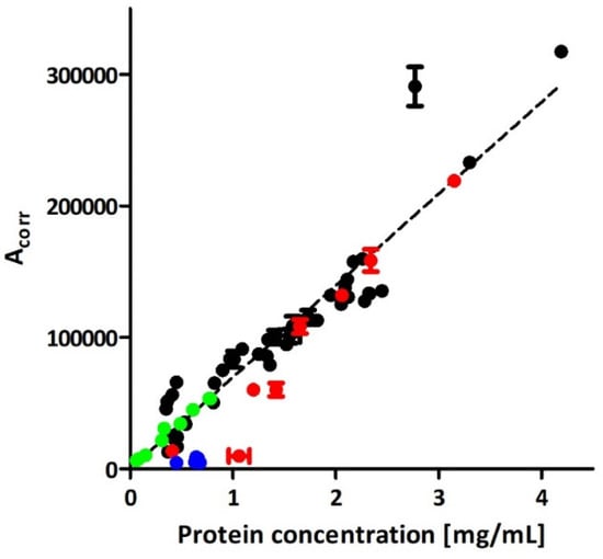 In our proof of concept work, insufficient purity of isolates accounted for a poor linear correlation between total protein content in isolates and the corrected peak area of EVs in CE (R2 = 0.81) [17]. The application of iodixanol cushion enabled significant improvement of the quality of isolates, which is reflected in the superior correlation between the CE and protein assay results (R2 = 0.97; Figure 2). Despite the iodixanol did not completely eliminating mechanical stress generated during centrifugation, the purity of ICUC isolates was considered superior over the isolates obtained with direct UC which explain the differences in isolation yields assessed with BCA and CE analyses (Figure 1F,G). The results indicate the overestimation of EVs content in direct UC samples with BCA due to the presence of abundant soluble and insoluble impurities. Indeed, direct UC isolates featured significantly higher content of proteins than expected from the calibration plot obtained for ICUC samples. A similar tendency was observed for the ICUC isolates, whose quality was considered low and were low abundant in EVs (red trace in Figure 2). The CE analysis of these low-purity isolates showed several additional signals (Figure S6), some of which were generated by macromolecular aggregates. However, the tendency seems to be less evident in samples with higher EVs content (red trace in Figure 2). No correlation between the isolates’ quality and bacterial strain type was found.