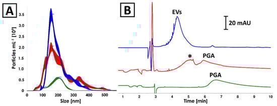 Comparison of (A) NTA and (B) CE analyses results of isolates obtained from (blue) Pectobacterium zantedeschiae culture, (red) culturing medium composed of M63 medium, 0.2% glycerol and 0.4% PGA, and (green) 0.4% PGA solution. The isolation process was described in Section 4.6. Asterisk (*) indicates unidentified component of the culturing medium isolate.