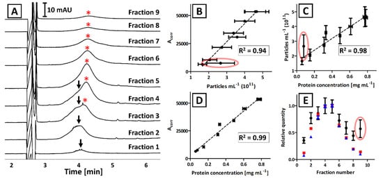Each fraction obtained with the IDGUC was characterized with CE, BCA, and NTA (Figure 4A–D). Linear correlation between CE and BCA measurements (R2 = 0.99; Figure 4D) was superior over the results that included NTA analyses (R2 = 0.93 and 0.89 for Figure 4B,C, respectively). The correlation between NTA results with CE and BCA was significantly greater when outlier (circled in red, Figure 4B,C) was excluded (R2 = 0.94 and 0.98, respectively).