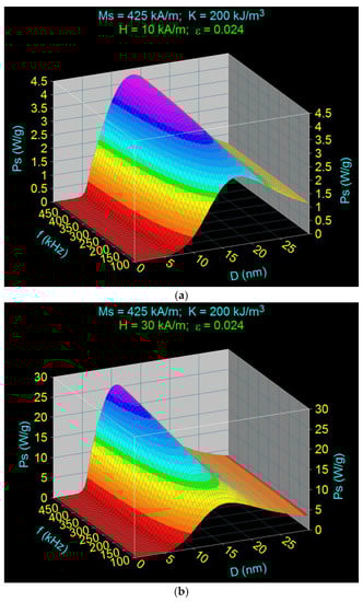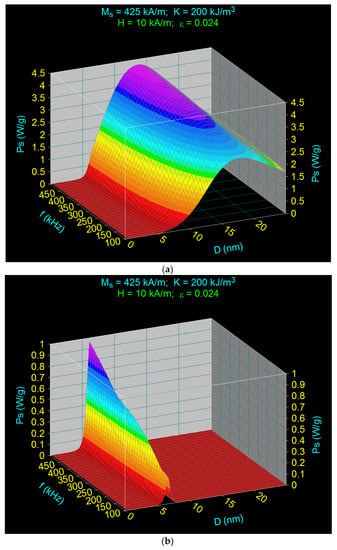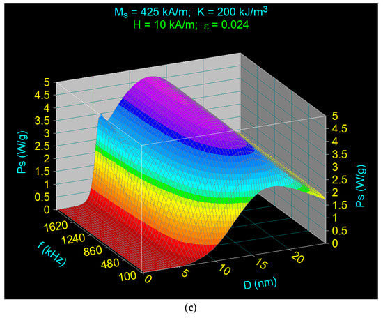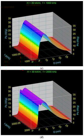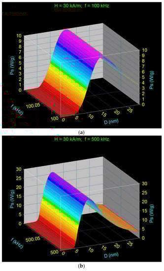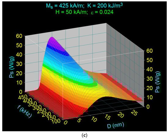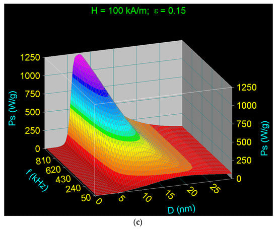 However, the nanoparticle diameter remains a critical parameter at higher frequencies (over 500 kHz) and at high magnetic fields (over 50 kA/m) (Figure 8b,c), for different frequencies and amplitudes of the magnetic field, which are shown in Table 6. The values obtained for the diameters of nanoparticles that give the maximums of the specific loss power, and their corresponding powers, for different frequencies and amplitudes of the magnetic field, are given in Table 6.