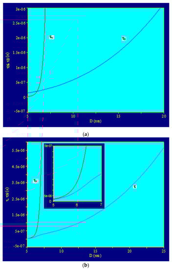 Representing the variation of Néel (), Brown (), and total relaxation times (τ) in the case of CoFe2O4 nanoparticles coated with liquid-dispersed γ-CDs, depending on the nanoparticle diameter (Equations (5)–(7), with Equation (9)), the curves in Figure 3 were obtained. The obtained results clearly showed that the Néel relaxation contribution was obtained at small nanoparticle sizes, for diameters <~6 nm, where the Néel relaxation time was significantly shorter than the Brown relaxation time (Figure 3a,b), and at large sizes of nanoparticles of >~7 nm, the contribution of relaxation was the Brown type, where the Brown relaxation time was significantly shorter than the Néel relaxation time. Therefore, at a larger nanoparticle diameter, the total relaxation time (Equation (7)) is determined only by the Brown relaxation time (Figure 3b). In the range of values of diameters of approx. 5.7–6.4 nm, there was a contribution of both magnetic relaxation processes in certain proportions (Figure 3b, inset), and at approx. 6.1 nm, their contributions became equal (the two relaxation times became equal, = ).