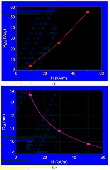 The variations of the maximum specific loss power (PsM) and the nanoparticle diameter corresponding to the maximums (DM) depend on the amplitude of the magnetic field for the frequency of 500 kHz, which are shown in Figure 5a,b. It can be observed that, while the maximum power increased quickly and almost linearly with the increase in the magnetic field amplitude (in the magnetic field considered), the diameter of the nanoparticles had a more pronounced decrease up to 30 kA/m, followed by a slower decrease in the rest of the range. Moreover, although the size of the nanoparticles corresponding to the maximum power decreased significantly (Figure 5b), the maximum specific loss power did not decrease, but increased, which occurred even more quickly (Figure 5a).