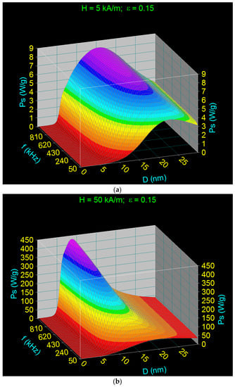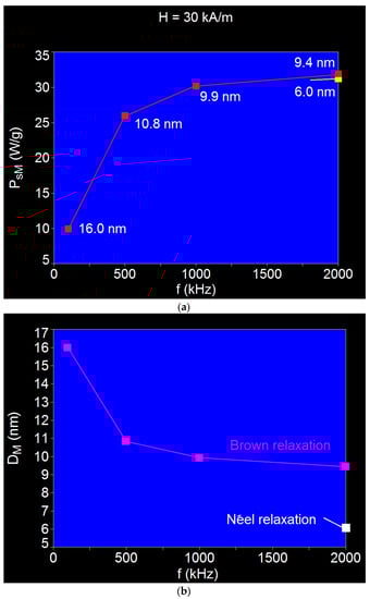 Furthermore, the maximum specific loss power (PsM) was obtained at a certain value of the nanoparticle diameter (DM), a diameter that is dependent on both the amplitude of the magnetic field and the frequency, as follows: (i) as the amplitude of the magnetic field increases, the diameter of the nanoparticles at which the maximum power is obtained decreases; and (ii) as the frequency increases, the nanoparticle diameter decreases.