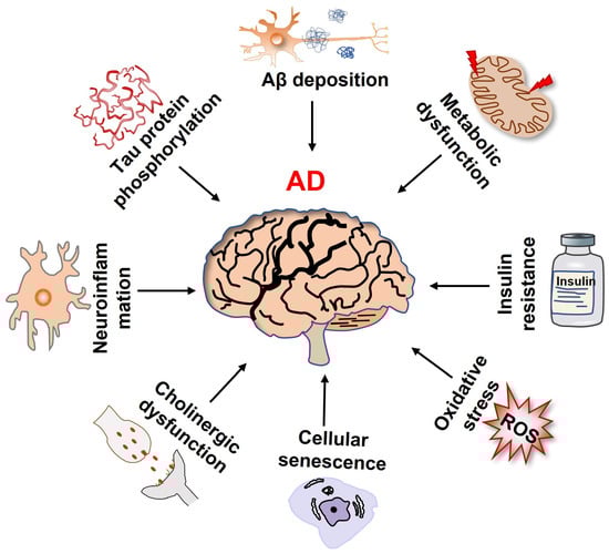 Alzheimer’s disease (AD), an elderly neurodegenerative disorder with a high incidence and progressive memory decline, is the major cause of dementia and is often accompanied by psychiatric symptoms []. Currently, there are no effective drugs to prevent and treat AD, which has become one of the most expensive, lethal, and burdening diseases of this century []. The pathological features of AD mainly include amyloid-β (Aβ) deposition and neurofibrillary tangles (NFTs) caused by the hyperphosphorylation of Tau protein. Several theories underlying the pathogenesis of AD have been posited (Figure 1), such as the amyloid protein cascade, Tau protein hyperphosphorylation, cholinergic dysfunction, oxidative stress, and neuroinflammation [,,,]. Currently, accumulating studies have shown that abnormal glucose metabolism in the brain is an early event before the pathological features of Aβ deposition. Thus, metabolic abnormalities are also considered to be the driving factors and hallmarks of AD [,]. The gradual decline in metabolic efficiency during aging renders neurons more vulnerable to toxic damage []. In addition, cellular senescence is also considered to be the main cause of cognition decline in AD. Although the relationship between metabolic imbalances, cell senescence, and AD pathogenesis has not been thoroughly elucidated, glucose metabolism in neural senescence paves a new way for a therapeutic strategy of AD []. In this paper, we undertook a brief review of the research progress in glucose metabolism, neural cell senescence, and AD, and discussed the potential application of glucose metabolic reprogramming for AD prevention, which may provide a theoretical basis for further understanding the pathogenesis and treatment of AD.