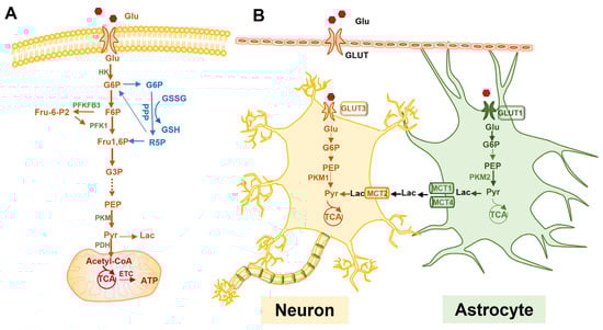 Neurons mainly rely on oxidative metabolism, using glucose as an energy source and using OXPHOS to provide sufficient energy for synaptic transmissions and neuronal function maintenance []. When the demand for energy increases, lactate and ketone bodies are also applied as substrates. Compared with other transporters, glucose transporter 3 (GLUT3), located in axons and dendrites, has a higher glucose binding affinity and a greater transport capacity to ensure the preferential use of glucose (Glu) by neurons []. Under normal conditions, glucose-6-phosphate (G-6-P) is formed by the action of hexokinase (HK) when glucose enters neurons. Due to the continuous degradation of phosphofructokinase-2/fructose-2,6-bisphosphatase 3 (PFKFB3) in neurons by proteasomes, PFKFB3 is unable to catalyze fructose-2,6-diphosphate (F-2,6-P) and activate fructose-phosphate kinase-1 (PFK1). Thus, G-6-P mostly generates pyruvate through pentose phosphorylation (PPP) and enters the tricarboxylic acid (TCA) cycle and electron transport chain (ETC) [] (Figure 2A). The nicotinamide adenine dinucleotide phosphate (NADPH) produced by PPP is used for the reutilization of glutathione, thus eliminating the oxygen free radicals produced by neuronal oxidation and avoiding neuronal oxidative damage [].