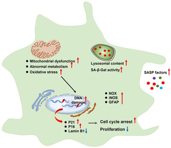 Characteristics of senescent astrocytes, such as cell cycle arrest and decreased proliferation, which are accompanied by mitochondrial dysfunction, abnormal metabolism, increased lysosomal content, SA-β-Gal activity, oxidative stress, DNA damage, senescence-associated gene expression, and SASP release. SASP, senescence-associated secretory phenotype; SA-β-Gal, senescence-associated β-galactosidase; NOX, NADPH oxidase; iNOS, inducible NO synthase; GFAP, glial fibrillary acidic protein.