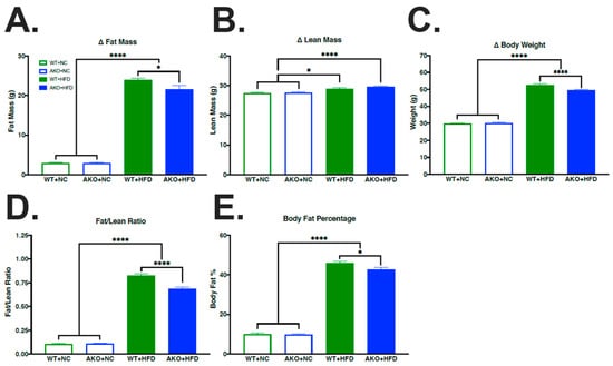 To determine if HFD-fed AKO mice had altered changes in body composition compared to HFD-fed WT mice, we measured the body composition of mice using EchoMRI. We demonstrate that HFD-fed mice had increased fat mass (p < 0.0001; Figure 1A), lean mass (p < 0.013; Figure 1B), body weight (p < 0.0001; Figure 1C), fat/lean ratio (p < 0.0001; Figure 1D), and body fat percentage (p < 0.0001; Figure 1E) compared to NC-fed mice. We also demonstrate that HFD-fed AKO mice had slight but significant decreased fat mass (p < 0.044; Figure 1A), body weight (p < 0.0001; Figure 1C), fat/lean ratio (p < 0.0001; Figure 1D), and body fat percentage (p < 0.029; Figure 1E) compared to HFD-fed WT mice.