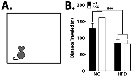 Prior studies indicate that HFD reduces locomotor activity [,]. In order to determine the effects of HFD on locomotor activity, mice were placed in an activity chamber for 2 h to measure general movement. We demonstrate that mice maintained on an HFD move significantly less compared to those maintained on NC, independent of genotype (p < 0.01; Figure 2B).