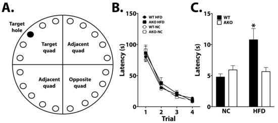 Despite no differences in learning, long-term spatial memory impairment was evident in WT mice maintained on an HFD as measured by increased latency to find the escape hole (Figure 3). AKO mice maintained on HFD are protected against HFD-induced spatial memory impairment (Figure 3). Importantly, these differences are not attributed to motor deficits, as a similar movement was observed in AKO and WT mice maintained on an HFD (Figure 2). These differences show that HFD-fed mice have impaired spatial memory rather than learning ability. Anxiety-related behavior was tested using an open field system, but no differences were seen between genotypes (see Supplementary Methods and Figures S1 and S2). We also demonstrate that short-term working reference memory is impaired in HFD-fed WT mice and that HFD-fed AKO mice are protected against this deficit (Figure 4). These findings are consistent with other reports []. It is also important to note that HFD-fed mice have an increase in body fat percentage compared to NC-fed mice for both genotypes. While HFD-fed AKO mice have a slightly lower body fat percentage compared to HFD-fed WT mice, they are still significantly higher than NC-fed AKO mice (Figure 1). Therefore, behavioral differences between groups cannot fully be explained by body fat percentage.