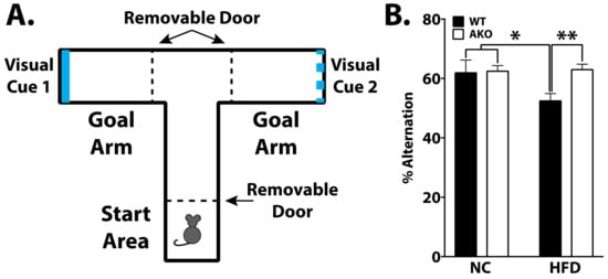 Loss of FABP4 rescues HFD-induced working reference memory decline. (A). Representation of T-maze apparatus to measure spatial working reference memory. Mice were placed in start arm and allowed free choice to either goal arm. Once body fully in arm, removable partition was closed allowing mice to stay in goal arm for 15 s and then placed back in start area. Mice underwent an additional 10 trials per day for a total of 2 days. Percent alternation was calculated as the number of spontaneous alternations (choosing the novel arm, unexplored from the previous trial) divided by the maximum number of alternations. (B) WT mice fed HFD have reduced alternations over all trials (* p < 0.05 vs. WT-NC and AKO-NC, ** p < 0.01 vs. AKO-HFD). Data analyzed via one-way ANOVA and Tukey’s post-test.