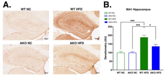 To determine if HFD-fed AKO mice had altered microglial activation in the hippocampus, we performed immunohistochemical staining for ionized calcium-binding adaptor molecule 1 (IBA1) in hippocampal tissues. We demonstrate that HFD-fed WT mice have increased hippocampal IBA1 expression compared to NC-fed mice (p < 0.001; Figure 5). We then demonstrate that HFD-fed AKO mice have decreased hippocampal IBA1 expression compared to HFD-fed WT mice (p < 0.02; Figure 5).