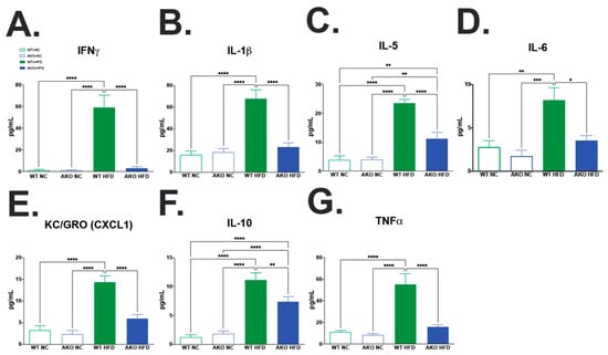 To determine if HFD-fed AKO mice had an altered inflammatory cytokine profile in the hippocampus, we performed a multiplex inflammatory marker screening in hippocampal tissues. We demonstrate that HFD-fed WT mice have increased IFNγ (p < 0.0001; Figure 6A), IL-1β (p < 0.0001; Figure 6B), IL-5 (p < 0.0001; Figure 6C), IL-6 (p < 0.008; Figure 6D), KC/GRO(CXCL1) (p < 0.0001; Figure 6E), IL-10 (p < 0.0001; Figure 6F), and TNFα (p < 0.0001; Figure 6G) in the hippocampus compared to NC-fed mice. We then demonstrate that HFD-fed AKO mice have decreased IFNγ (p < 0.0001; Figure 6A), IL-1β (p < 0.0001; Figure 6B), IL-5 (p < 0.0001; Figure 6C), IL-6 (p < 0.014; Figure 6D), KC/GRO(CXCL1) (p < 0.0001; Figure 6E), IL-10 (p < 0.007; Figure 6F), and TNFα (p < 0.0001; Figure 6G) the hippocampus compared to HFD-fed WT mice (Figure 6A–G).