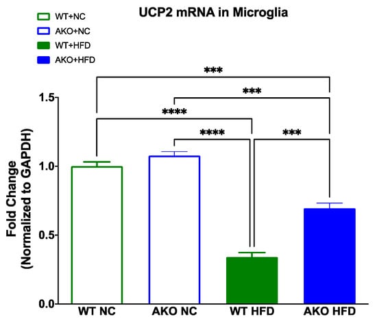 To determine if loss of FABP4 affects UCP2 mRNA expression under HFD in microglia, we performed a qRT-PCR analysis of UCP2 mRNA from microglia isolated from brain tissues. We demonstrate that HFD-fed WT mice have decreased UCP2 compared to NC-fed mice (p < 0.0001; Figure 7). We then demonstrate that HFD-fed AKO mice have increased UCP2 compared to HFD-fed WT mice (p < 0.001; Figure 7).