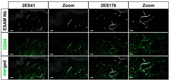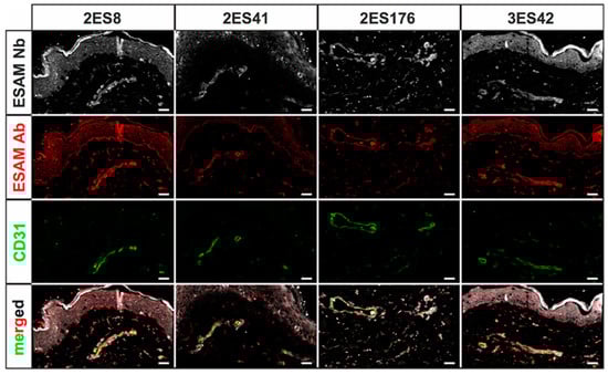 Immunofluorescence stainings of human skin cryosections using the directly-labeled hESAM-specific Nbs. Representative images of 2D immunofluorescence stainings of 5 µm cryosections of human skin specimens stained with the respective Nb (white) and CD34 (green), an antibody visualizing blood vessels. Stained antigens are indicated next to each panel, the Nb clone used is indicated above each panel. Scale bars = 50 µm.