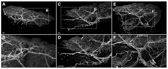 Whole-mount stainings of entire human skin biopsies using a directly-labeled hESAM-specific Nb. Whole-mount immunofluorescence stained human skin punch biopsies (5 × 5 mm) stained with the ‘2ES41’ Nb clone (white) and optically sectioned using a light sheet microscope. Shown are representative projections of 3D-rendered computer reconstructions. Overview images of three different skin biopsies are shown in the top panels (A,C,E), whereas the bottom panels (B,D,F) depict images with higher magnification of the framed areas. Scale bars = 50 µm.