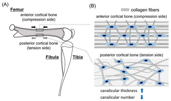 In lamellar bone, spindle-shaped lacunae are aligned to the direction of collagen fibers and canaliculi are aligned perpendicularly, whereas lacunae in disordered collagen fibers are rounded and the canaliculi are oriented isotropically [10,11,12]. Animal studies, which examined the relationship of lacunocanalicular structure and mechanoresponses, are very limited. In this review, we discuss the differential development of the lacunocanalicular structure in the compression and tension sides of femoral cortical bone in wild-type mice, and the relationship between lacunocanalicular structure and mechanoresponses by comparing three mouse models.