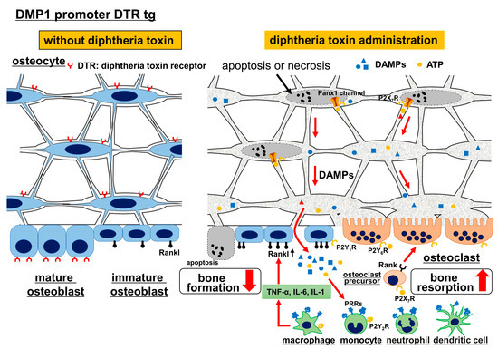 There is no ideal animal model for studying the relationship between lacunocanalicular structure and mechanoresponses, because it is impossible to obtain animals that have abnormal lacunocanalicular structure but a normal number of osteoblasts, osteoclasts and osteocytes, all of which are functionally normal. The first example is the ablation of osteocytes by diphtheria toxin in transgenic (tg) mice expressing the diphtheria toxin receptor under the control of the DMP1 promoter, which directs the expression to osteocytes and terminally differentiated osteoblasts [35] (Figure 2). Diphtheria toxin induced apoptosis or necrosis in osteocytes and terminally differentiated osteoblasts. As most osteocytes died by apoptosis, necrosis or secondary necrosis, bone resorption was markedly enhanced and the necrotic bone was replaced by bone remodeling as previously reported [21,22,23,24]. Further, TNF-α and IL-1, which are induced by DAMPs, activate the NF-κB signaling pathway and inhibit osteoblast differentiation and bone formation [36,37,38,39]. Thus, osteocyte ablation by diphtheria toxin enhanced bone resorption and inhibited bone formation [29,35] (Figure 2 and Figure 4).