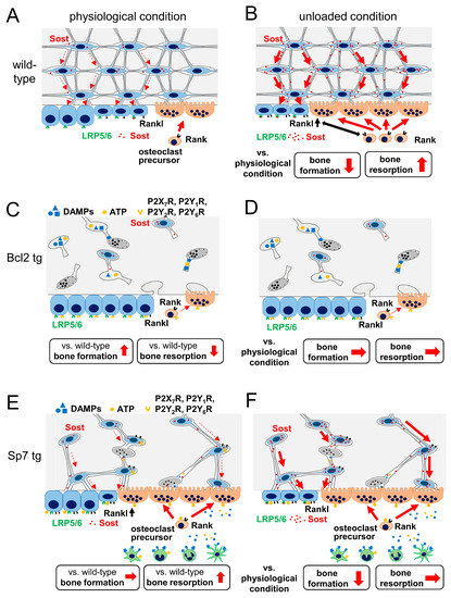The second example is osteoblast-specific Bcl2 tg mice under the control of the 2.3 kb Col1a1 promoter, which directs the transgene expression to osteoblasts [19,20] (Figure 3C). In Bcl2 tg mice, 80% of the lacunae were positive for TUNEL by 4 months of age. Apoptosis is due to a reduction in the number of osteocyte processes and canaliculi, which is likely caused by a complex formation of Bcl2, actin and gelsolin that impairs the gelsolin-severing activity to increase actin polymerization [19,20,41]. As osteocyte processes and canaliculi are necessary for acquiring oxygen and nutrition, their reduction causes osteocyte apoptosis, although the frequency of osteocyte apoptosis depends on the extent of the reduction. As TUNEL-positive lacunae gradually increases in Bcl2 tg mice, reaching up to 80%, most TUNEL-positive osteocytes should undergo secondary necrosis [20]. However, bone resorption was reduced and bone remodeling did not occur in Bcl2 tg mice. As co-culture of primary osteoblasts from Bcl2 tg mice or Bcl2-overexpressed wild-type primary osteoblasts with bone marrow-derived monocyte/macrophage lineage cells showed normal osteoclastogenesis, reduced bone resorption was likely due to disruption of the lacunocanalicular network [19,20]. This disrupted lacunocanalicular network interrupts the release of DAMPs and ATP from necrotic osteocytes and apoptotic osteocytes, respectively, to the bone surface and vascular channels, and impairs the removal of dead osteocytes by bone resorption. It enabled us to observe the functions of the osteocyte network without the effects of osteocyte death in Bcl2 tg mice (Figure 3C and Figure 4). The reduction in bone resorption in Bcl2 tg mice suggests that the lacunocanalicular network positively regulates bone resorption under physiological conditions.