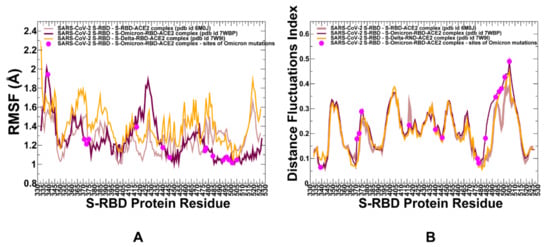 Conformational dynamics profiles obtained by averaging results from 10 independent MD simulations of the SARS-CoV-2, S-RBD complexes with ACE2 for the WT S-RBD, S Delta RBD and S-Omicron RBD. (A) The RMSF profiles for the RBD residues obtained from the simulations of the S-RBD WT complex with ACE2, pdb id 6M0J (in light brown lines); S Omicron RBD complex with ACE2, pdb id 7WBP (in maroon lines); and S Delta RBD complex with ACE2, pdb id 7W9I (in orange lines). The positions of the Omicron mutational sites are highlighted in magenta-colored filled circles. (B) The distance fluctuations stability index obtained from the simulations of the S-RBD WT complex with ACE2, pdb id 6M0J (in light brown lines); S Omicron RBD complex with ACE2, pdb id 7WBP (in maroon lines); and S Delta RBD complex with ACE2, pdb id 7W9I (in orange lines). The positions of the Omicron mutational sites are highlighted in magenta-colored filled circles.