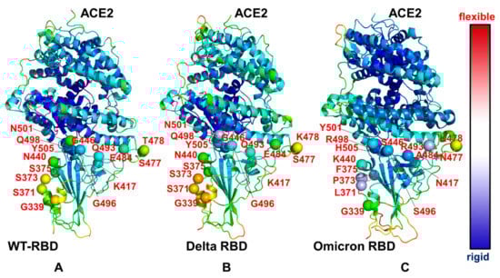 Structural maps of the conformational profiles obtained from the simulations of the SARS-CoV-2 S-RBD variant complexes. Conformational mobility map obtained from the simulations of the S-RBD WT complex with ACE2, pdb id 6M0J (A); S Delta RBD complex with ACE2, pdb id 7W9I (B); and S Omicron RBD complex with ACE2, pdb id 7WBP (C). The structures are shown in ribbons with the rigidity–flexibility sliding scale colored from blue (most rigid) to red (most flexible). The positions of sites targeted by Omicron mutations are shown in spheres colored according to their mobility level. The positions are highlighted and fully annotated on all panels. Note the progressive stabilization of the binding interface regions and mutational sites in the S Omicron RBD complex.