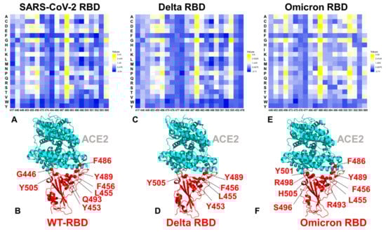 Ensemble-based mutational scanning of protein stability and binding for the SARS-CoV-2 S-RBD complexes with ACE2. (A) The mutational scanning heatmap for the S-RBD WT complex with ACE2. The binding energy hotspots correspond to residues with high mutational sensitivity. (B) Structural map of the binding energy hotspots for the S-RBD WT complex. S-RBD is in red ribbons and ACE2 is in cyan ribbons. The energetic hotspots are shown in red spheres and annotated. (C) The mutational scanning heatmap for the S Delta RBD complex with ACE2. (D) Structural map of the binding energy hotspots for the S-RBD WT complex. The energetic hotspots are shown in red spheres and annotated. (E) The mutational scanning heatmap for the S Omicron RBD complex with ACE2.; (F) Structural map of the binding energy hotspots for the S-RBD WT complex. The energetic hotspots are shown in red spheres and annotated. Mutational scanning was performed for the S-RBD interfacial residues calculated using the BeAtMuSiC approach [,,]. The heatmaps show the computed binding free energy changes for 20 single mutations on the sites of variants. The squares on the heatmap are colored using a 3-colored scale blue–white–yellow, with yellow indicating the largest unfavorable effect on stability. The standard errors of the mean for binding free energy changes were based on a different number of selected samples from a given trajectory (500, 1000 and 2000 samples) are within 0.12–0.22 kcal/mol.
