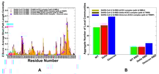 where is the change of the ASPL under mutational scanning averaged over all protein residues in the S-RBD and σ is the standard deviation. The ensemble-averaged Z–scores ASPL changes were computed from the network analysis of the conformational ensembles using 1000 snapshots of the simulation trajectory for the native protein system. The Girvan–Newman algorithm [,,] was used to identify local communities. In this approach, edge centrality (also termed as edge betweenness) is defined as the ratio of all the shortest paths passing through a particular edge to the total number of shortest paths in the network. The method employs an iterative elimination of edges with the highest number of the shortest paths that pass through them. By eliminating edges, the network breaks down into smaller communities. The algorithm starts with one vertex, calculates edge weights for paths that pass through that vertex, and then repeats it for every vertex in the graph and sums the weights for every edge. However, in complex and dynamic protein structure networks, it is often that the number of edges can have the same highest edge betweenness. An improvement of the Girvan–Newman method was implemented, and the algorithmic details of this modified scheme were given in our recent studies [,]. Briefly, in this modification of the Girvan–Newman method, instead of a single highest edge betweenness removal, all highest betweenness edges are removed at each step of the protocol. This modification makes the determination of the community structure invariant to the labeling of the nodes in the graph and leads to a more stable solution. The modified algorithm proceeds through the following steps: (a) Calculate the edge betweenness for every edge in the graph; (b) Remove all edges with the highest edge betweenness within a given threshold; (c) Recalculate the edge betweenness for the remaining edges; and (d) Repeat steps b–d until the graph is empty.