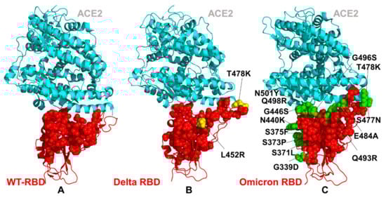 - Han, P.; Li, L.; Liu, S.; Wang, Q.; Zhang, D.; Xu, Z.; Li, X.; Peng, Q.; Su, C.; Huang, B.; et al. Receptor binding and complex structures of human ACE2 to spike RBD from omicron and delta SARS-CoV-2. Cell 2022, 185, 630–640. [Google Scholar] [CrossRef] [PubMed]