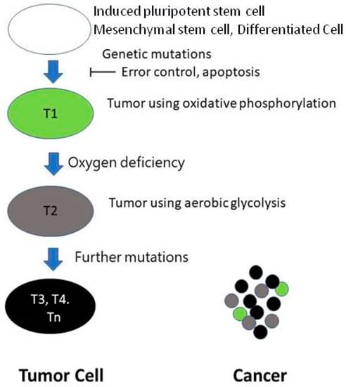 In developing a malignant tumor, the first step is the appearance of a mutant cell. The second problem is that the error control mechanism is altered. Thus, the mutant cell is not eliminated []. The multiplying mutant cells are the progenitor cells of the tumor (T1), using oxidative phosphorylation. The distance between the T1 containing growing tumor cells and the supplying blood vessel is continually increasing. The growing new tumor has no vessels. Thus, at a certain point, the partial tissue pressure of the O2 (pO2) level will not be enough for the proper mitochondrial function []. At the same time, hypoxia-induced factor-1 alpha (HIF-1α) will not be hydrolyzed, resulting in the further development of the tumor; cells able to live in an anoxic environment (tumor stem cells) will be created (T2). The HIF system will further develop the tumor, creating tumor cells with new behaviors (T3, T4, Tn). Between these cells, competition exists. Cancer is mainly formed by highly malignant cells, but other cells, including T1 with oxidative phosphorylation, are also present in the tumor (Figure 1).