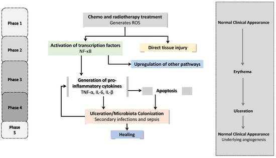 In the last decades, substantial evolution has taken place in the understanding of the complex mechanism behind the development of mucositis [6]. A five-phase model that begins with an (i) initiation involving cell injury, (ii) elevation of inflammatory cytokines, a (iii) primary damage response, and (iv) signaling and amplification of the inflammatory cascade, followed by (v) ulceration and mucosal repair through epithelial proliferation, has been reported by different authors [2,3,16,47]. Thus, OM is characterized by a cascade of events that occur simultaneously and are mechanistically related (Figure 1). Therefore, each factor that drives each phase may constitute a possible therapeutic target [16].
