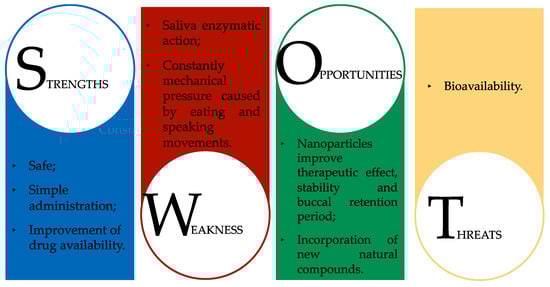 A SWOT diagram (Figure 2) was constructed with the aim of summarizing the previously described strengths, weaknesses, opportunities, and threats of employing natural products for the prevention/treatment of OM.
