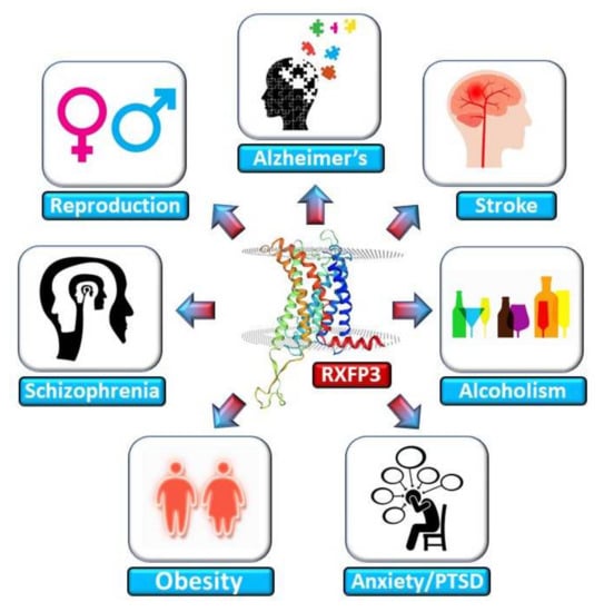It is now well appreciated that many classical central nervous system neurodegenerative disorders, such as Alzheimer’s, Parkinson’s, and Huntington’s disease, share many common etiological features with perhaps the primary one being metabolic dysfunction [,,,]. With respect to AD, it has been shown that RXFP3 levels are significantly altered in the neocortex of depressed Alzheimer’s patients []. Alzheimer’s disease is primarily represented as a dysfunctional capacity for short-term memory formation and then, at a later stage, a dysfunction in long-term memory recollection. It is relevant to note that depletion of RXFP3 levels in the brain have been associated with long-term memory regulation in adult mice []. In addition to long-term memory recall, RXFP3 functionality has also been associated with spatial memory formation [,].