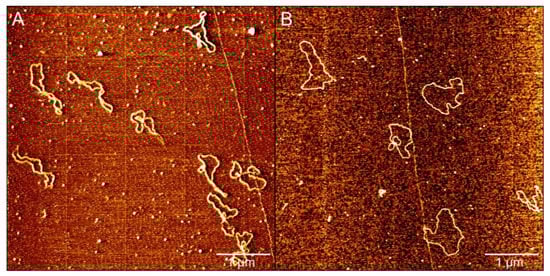 (A) AFM images of pBR322 plasmids in deposition buffer (25 mM KCl, 10 mM MgCl2, 10 mM HEPES (pH 7.5)). (B) AFM images of pBR322 plasmids in deposition buffer (1 mM MgCl2, 10 mM HEPES (pH 7.5)) by syringe pump, and the flow rate is 2 min/mL.