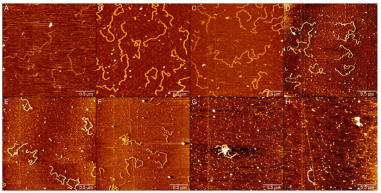 AFM images of pBR322 plasmids in deposition buffer (1 mM MgCl2, 10 mM HEPES (pH 7.5)) at different concentrations of PN. (A) Without PN. In (B–H), the concentration of PN is 50 µM, 100 µM, 150 µM, 200 µM, 300 µM, 400 µM, 1 mM.