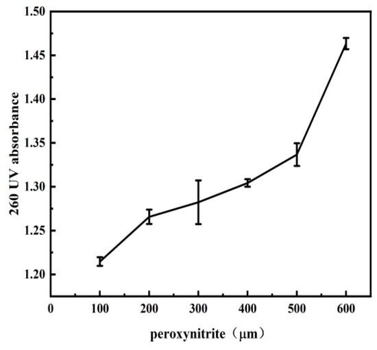 To confirm further the effect of single strand break in DNA by peroxynitrite, we used ultraviolet spectroscopy to measure the hyperchromicity of DNA solution with or without PN. The hyperchromicity of DNA occurs when the DNA duplex is denatured or when the two single DNA strands are being separated partly or wholly [49]. We measured UV absorbance at 260 nm of DNA (50 µM−1 mM) solution containing various concentrations of PN, as shown in Figure 4. We can see that absorbance increases monotonically with the concentration of PN. The observation indicates the DNA structural distortion, which is either due to the opening of the double helix or single stranded breaks. These spectroscopic data confirm the mechanism of single strand break further and are consistent with the observation by AFM images in previous sections.
