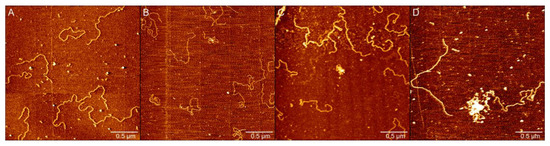 AFM images of 4000 bp linear DNA in deposition buffer (1 mM MgCl2, 10 mM HEPES (pH 7.5)) which contain 500 mM ectoine at different concentrations of PN. (A) 300 µM, (B) 400 µM, (C) 500 µM, (D) 1 mM.
