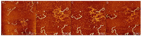 AFM images of 4000 bp linear DNA in deposition buffer (1 mM MgCl2, 10 mM HEPES (pH 7.5)) with 300 µM PN. (A–D) Images of repeated scanning on the same area for single stranded DNA.