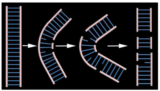 Based on the data by AFM and spectroscopy, we proposed a possible molecular mechanism on the interaction between PN and DNA to explain the phenomenon, as shown in Figure 7 schematically. In the mechanism, PN attacks DNA, resulting in the oxidation of deoxyribose or formation of 8-Nitro-Guanine, being labile, easy to generate a single strand nicked, ultimately resulting in single strand breaks [9,50]. With the concentration of PN increasing, the number of single strand nicks increases, and the compact DNA double helix structure suffers varying degrees of damage. This allows the DNA to be more flexible, leading to a tangled and slightly compressed structure. When the nicks between the two strands are at the same position, or two SSBs arise very closely, double-strand breaks (DSBs) are formed [4].