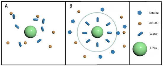 The DNA protection mechanism by ectoine can be explained schematically in Figure 8 based on a preferential exclusion of cosolute around the macro-molecular compounds. Ectoine shows a zwitterionic form in aqueous solution, with a carboxylic group bearing the negative charge and a partially mesomeric structure for the location of the positive charge in the pyrimidine ring. Since DNA itself has a pronounced negative charge at the backbone, the occurrence of strong electrostatic interactions between DNA and the positively charged groups of ectoine is favored. The cosolute molecules that are repelled from the immediate vicinity of the DNA surface are successively replaced by excess water molecules, which stabilize the native form of DNA in terms of a preferential hydration mechanism. This stable water shell is an effective barrier against the PN approaching DNA. Figure 8A shows the case of mild counterion concentration without ectoine in solution. In this case, the water shell around the DNA is not very organized, and ONOO− is scattered around the DNA. As shown in Figure 8B, when the external base is added to the solution, the water shell becomes more organized due to the preferential rejection of the cosolute, forming a protective shell that blocks the interaction between DNA and PN, thus achieving the protective effect.