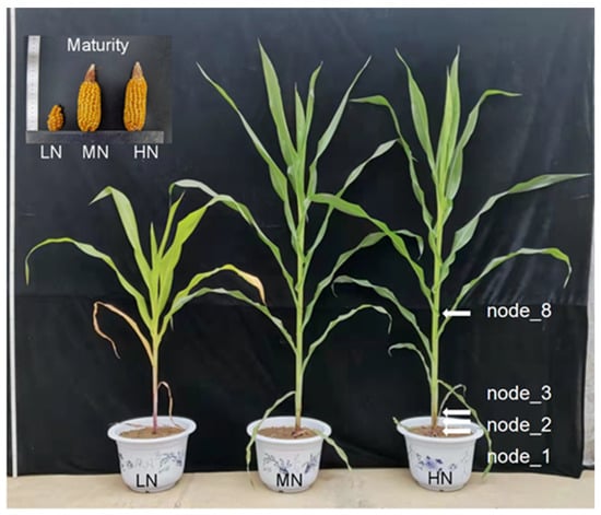 Phenotypes of maize plant at 62 days after sowing and ears at maturity under low to high nitrogen supply. LN, no nitrogen application; MN, 0.15 g N kg−1; HN, 0.30 g N kg−1; Arrows indicate the stem node position.