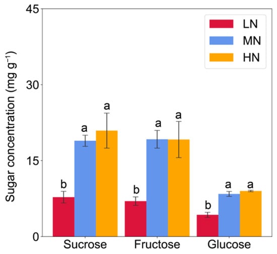 Sugar concentrations in the leaf (the 8th fully expanded) of maize plants under low, medium, and high nitrogen supply at 62 days after sowing. Vertical bars indicate the standard error of the mean (n = 4). Different letters above the columns represent significant differences within each sugar between nitrogen treatments (p < 0.05). LN, no nitrogen application; MN, 0.15 g N kg−1; HN, 0.30 g N kg−1.