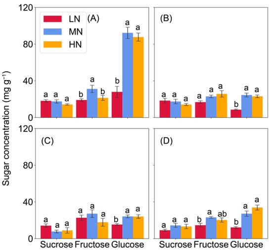Sugar concentrations in the nodes of maize plants under low, medium, and high nitrogen supply at 62 days after sowing. (A) Stem base node (node 1); (B,C) two nodes above the stem base node (Nodes 2 and 3, respectively); (D), Node 8 where the 8th leaf is located. Vertical bars indicate the standard error of the mean (n = 4). Different letters above the columns in each panel represent significant differences between nitrogen treatments for each sugar (p < 0.05). LN, no nitrogen application; MN, 0.15 g N kg−1; HN, 0.30 g N kg−1.
