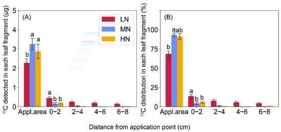 The absolute amount (A) and relative distribution (B) of 13C in the 8th fully expanded leaf following foliar application of 13C labeled sucrose at the leaf tip. Columns with no letter in common are significantly different between nitrogen treatments within each leaf fragment (p < 0.05). Vertical bars indicate the standard error of the mean (n = 4). Error bars are not shown for leaf fragments where 13C was only detected in one or two of the four replicates. Appl. area means the application area of 13C-sucrose labelled near the leaf tip.